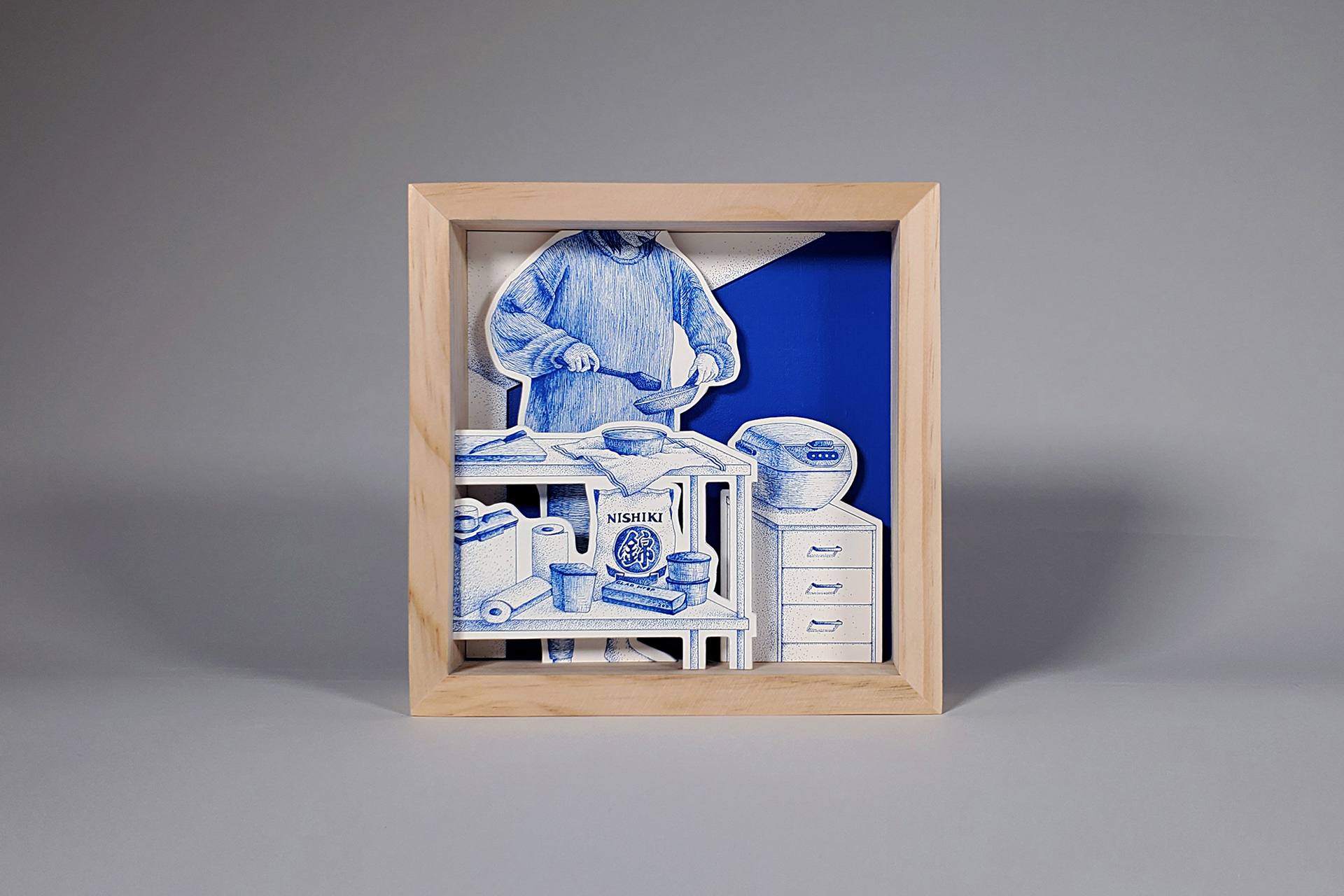 8in. x 8in. x 1.5in. / 2 ply White Museum Board, Gel-Ink Ballpoint Pen 0.38m, Wood Panel, Acrylic Paint, Wooden Rod Apr. 2019